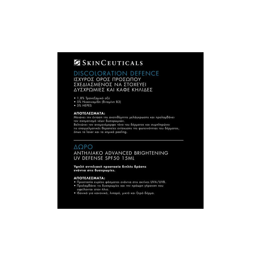Ο Discoloration Defence Serum της SkinCeuticals είναι ένας ισχυρός καθημερινός ορός προσώπου, σχεδιασμένος να βελτιώνει την όψη των δυσχρωμιών, ακόμα και αυτών που είναι δύσκολες στη διαχείριση, όπως οι επίμονες πανάδες και τα σημάδια ακμής. Με σύνθεση που περιλαμβάνει τρανεξαμικό οξύ, νιασιναμίδη και H.E.P.E.S., προσφέρει 41% μείωση στις δυσχρωμίες, λάμψη και βελτιωμένο τόνο στην επιδερμίδα. Χωρίς άρωμα και ιδανικός για χρήση μετά από peelings ή laser.